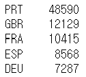 value_counts 함수를 사용하여 불러온 데이터의 country 열 값의 총합을 구하고 상위 5개의 값을 출력합니다. 결과를 보면 PRT, GBR, FRA, ESP 그리고 DEU 국가 코드를 가진 국가에서 호텔 예약이 많은 것을 확인할 수 있습니다.