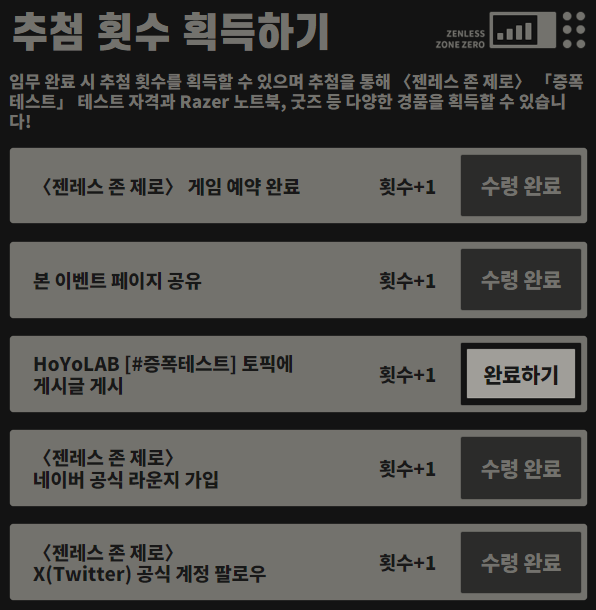 추첨 횟수를 얻을 수 있는 미션이 있습니다.