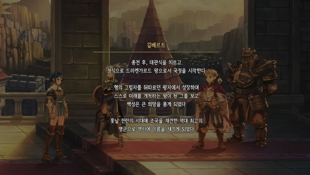 왕위를 계승하는 어레인을 축하해 주는 동료들 그리고 최종 전투 후 동료들의 후일담 등 특별하지 않지만 그래서 좋았던 콘텐츠 덕분에 마지막까지 즐거웠습니다. 왼쪽에 보시면 '일레니아' 여왕이 살아있는데요, 아직 게임을 클리어하지 않은 분들은 어떻게 여왕이 살아있는지 꼭 진엔딩 보시고 확인하시길 바랍니다.
