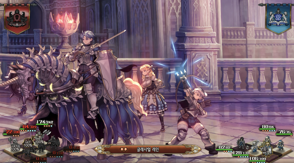 가장 중요한 어레인 부대는 어레인, 베렝가리아, 버지니아, 유니피 그리고 스칼렛으로 구성했습니다. 베렝가리아는 적에게 디버프를 걸고 추격 대미지로 추가 대미지를 넣었습니다. 버지니아와 어레인은 방어에 집중했습니다. 어레인에게 '성각수의 성검'을 주니 대미지도 잘 들어가서 완벽한 캐릭터가 됐습니다. 스칼릿은 게임 내에서 최고의 힐러이기 때문에 어레인 부대에 배치했습니다.
