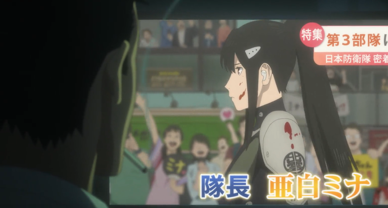 카프카의 소꿉친구인 '미나'는 주목받는 방위대 대장 중 한 명입니다. 어린 시절 카프카와 미나는 함께 방위대 대원이 되어 괴수를 전멸시키자는 약속을 하게 됩니다. 보란 듯이 대장이 된 미나와 달리 사체 청소일을 하고 있는 카프카는 현재 자신의 삶을 만족하면서도 현실의 벽에 부딪혀 방위대를 포기한 사실을 계속 아쉬워합니다.