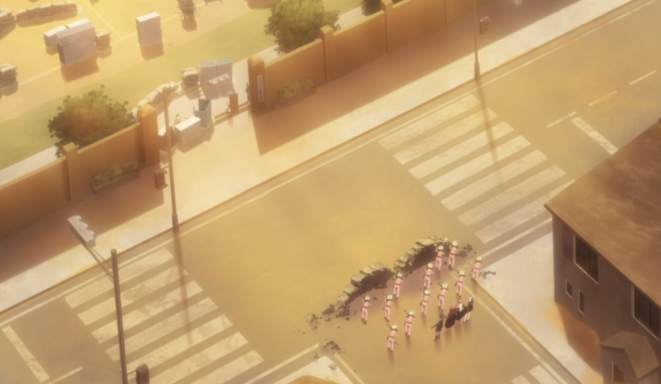 서로 대치중인 상태에서 무츠키가 폭탄을 던집니다. 그런데 아비도스 엄폐물 조금 앞에서 폭탄이 폭발합니다. 두 부대의 거리를 보면 먼 거리도 아닙니다. 아마 제작진에서 무츠키같이 가냘픈 학생이 큰 폭탄을 멀리 던질 수 없다고 생각했나 봅니다. 얘들 탱크랑도 맨 몸으로 싸우는데요.