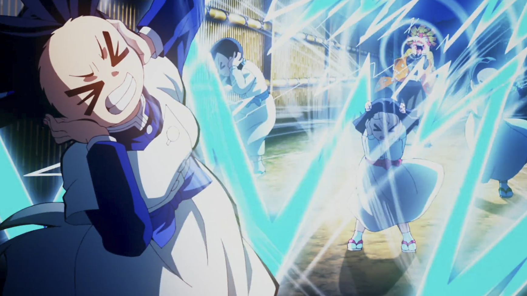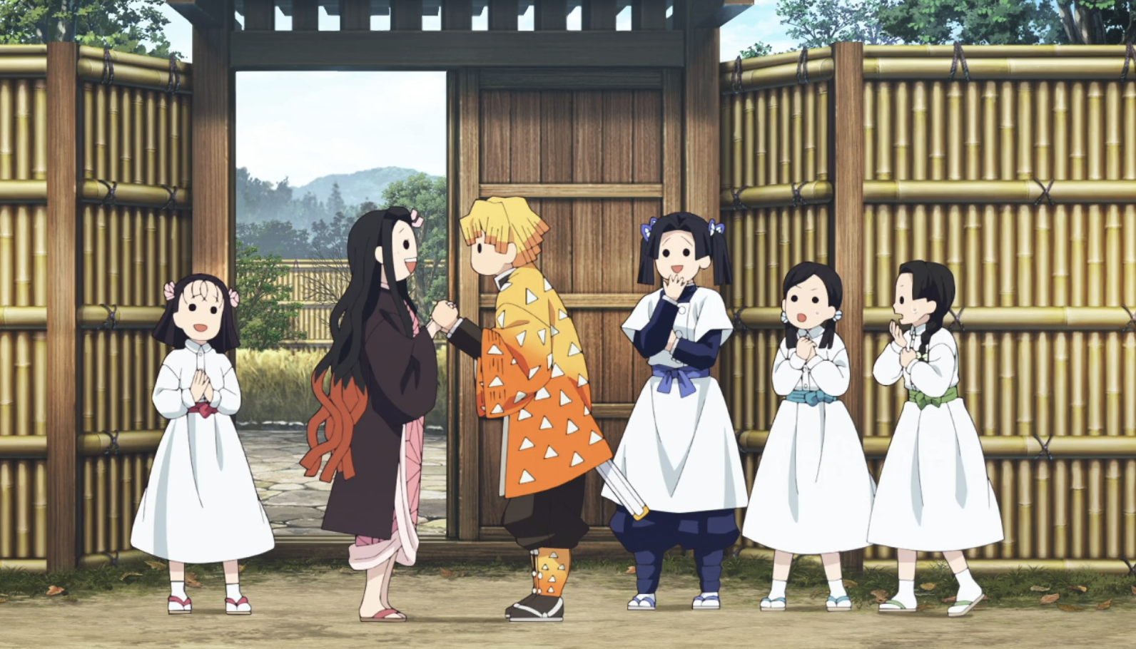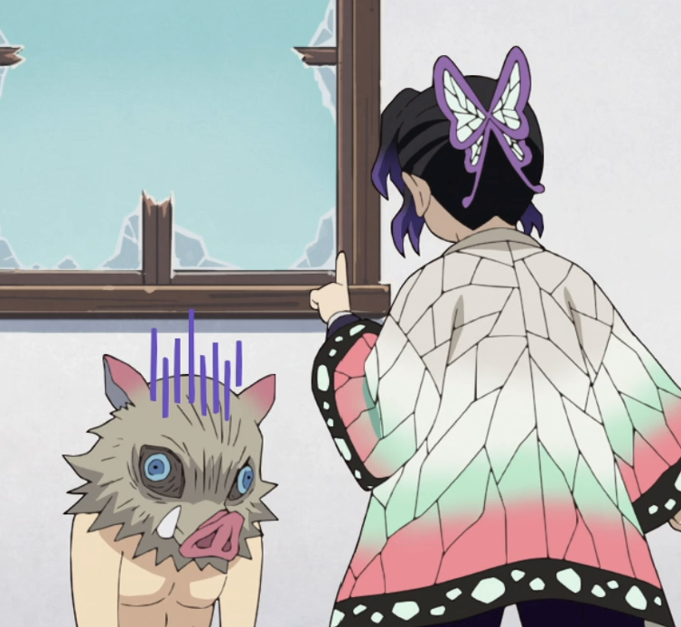 치료 후 임무에서 돌아온 젠이츠를 네즈코가 반겨줍니다. 평소에도 네즈코에게 마음이 있던 젠이츠는 기쁜 나머지 입으로 번개의 호흡을 사용합니다. 하지만 네즈코가 자신을 이노스케라고 부르자 화가 난 젠이츠는 이노스케를 잡으러 갑니다. 이노스케가 깨어나자마자 네즈코에게 자신의 이름을 기억하도록 세뇌시키고 있었습니다.