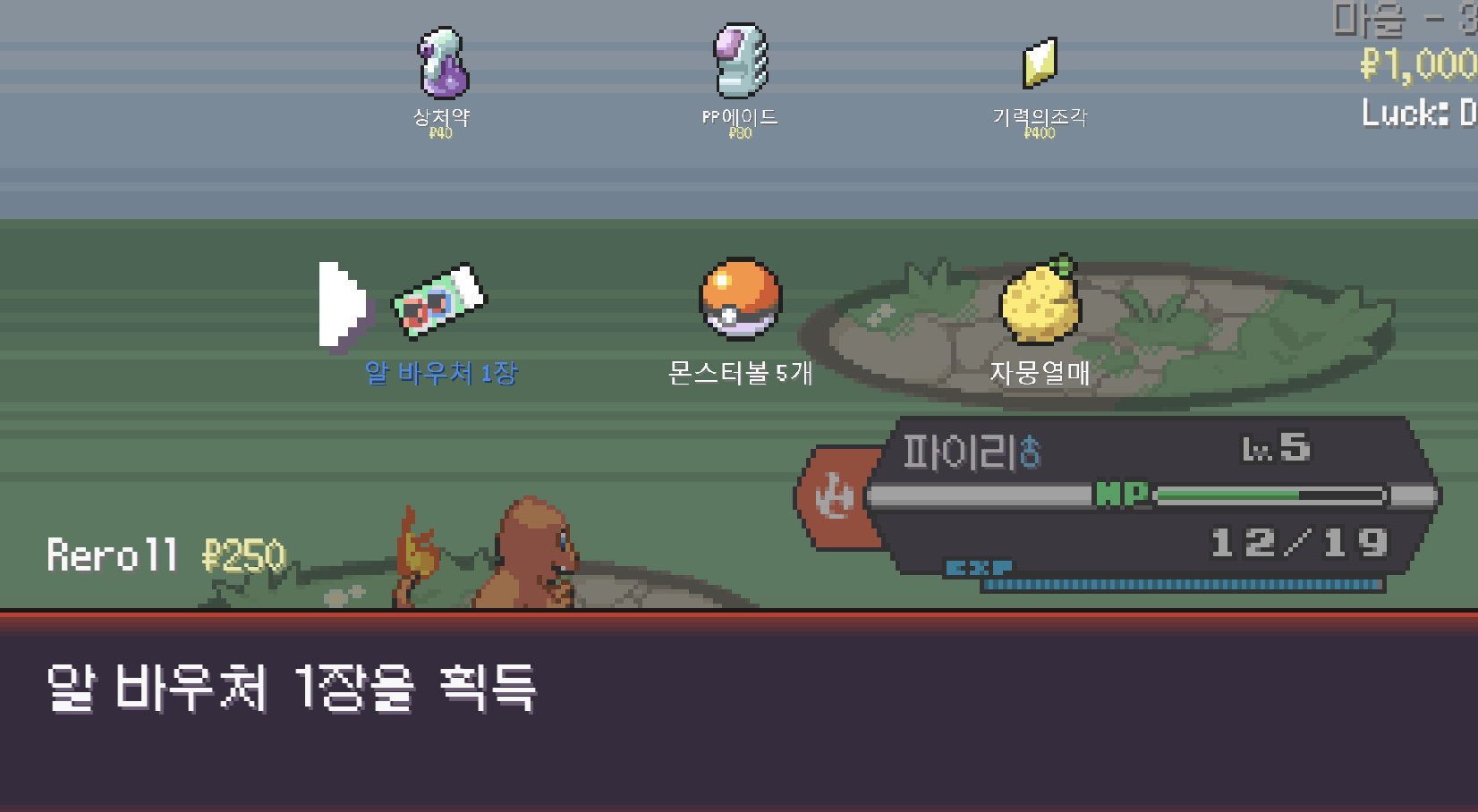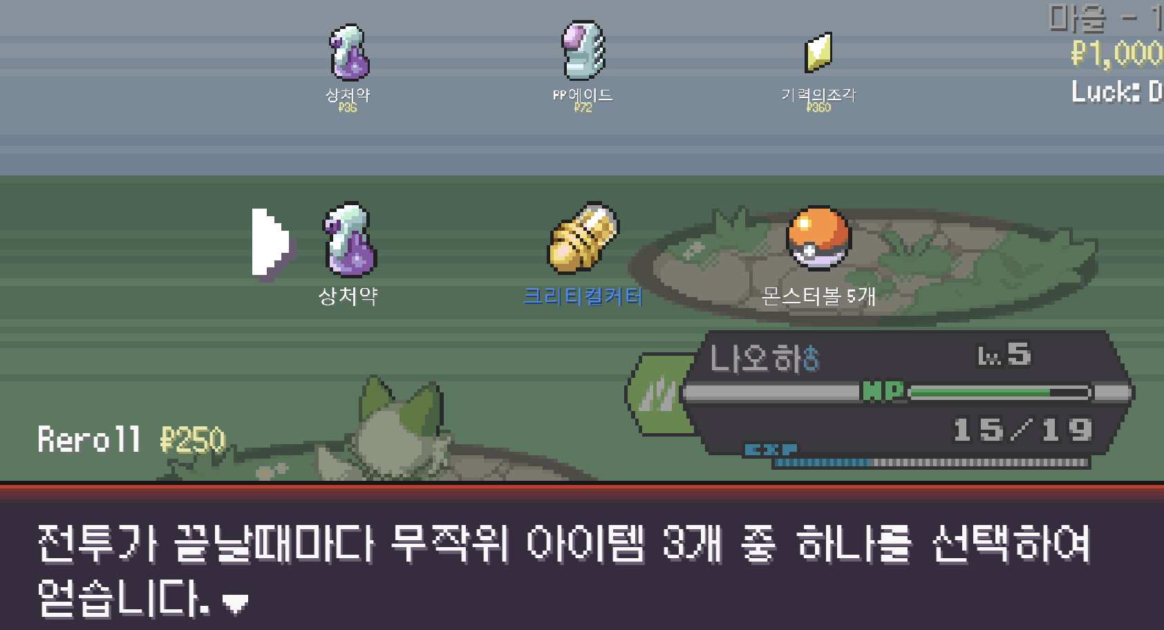 스타트 포켓몬들 고르고 게임을 시작하면 야생 포켓몬이 연속해서 등장합니다. 각 스테이지에 등장하는 야생 포켓몬을 쓰러뜨리면 재화를 얻을 수 있으며 또한 아이템을 선택할 수 있습니다. 가격이 있는 아이템은 재화로 무제한 구매할 수 있으며 가격이 없는 아이템은 하나 선택하면 바로 다음 스테이지로 넘어갑니다. 1회 선택 아이템은 랜덤으로 등장하며 학습장치, 그리고 메가진화 아이템 등 높은 등급의 아이템을 초반에 얻으면 스테이지 진행이 유리해집니다.