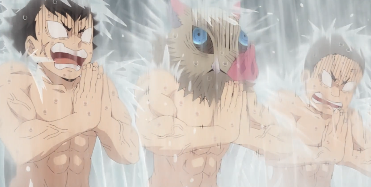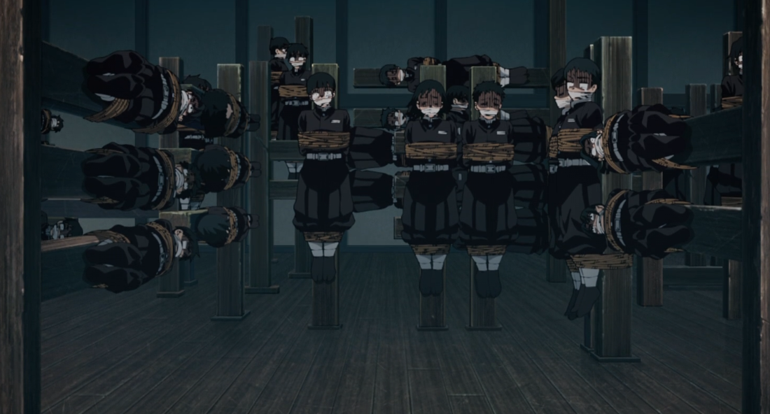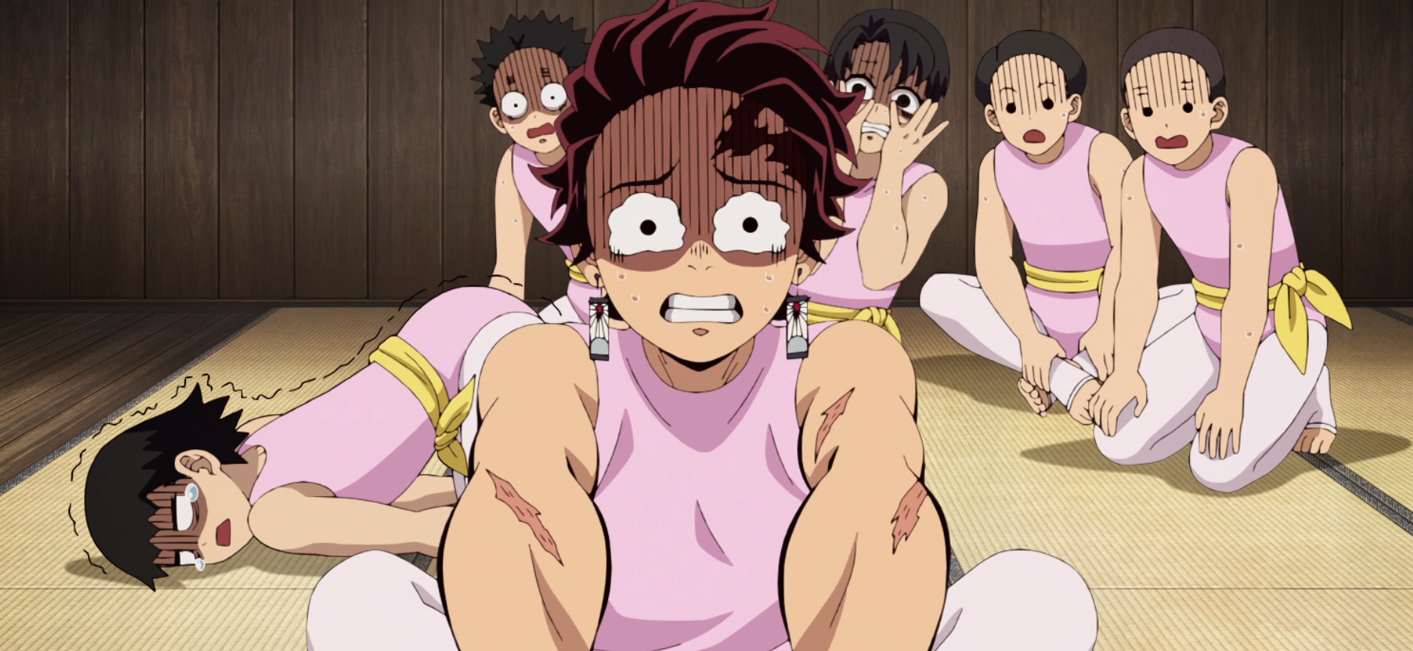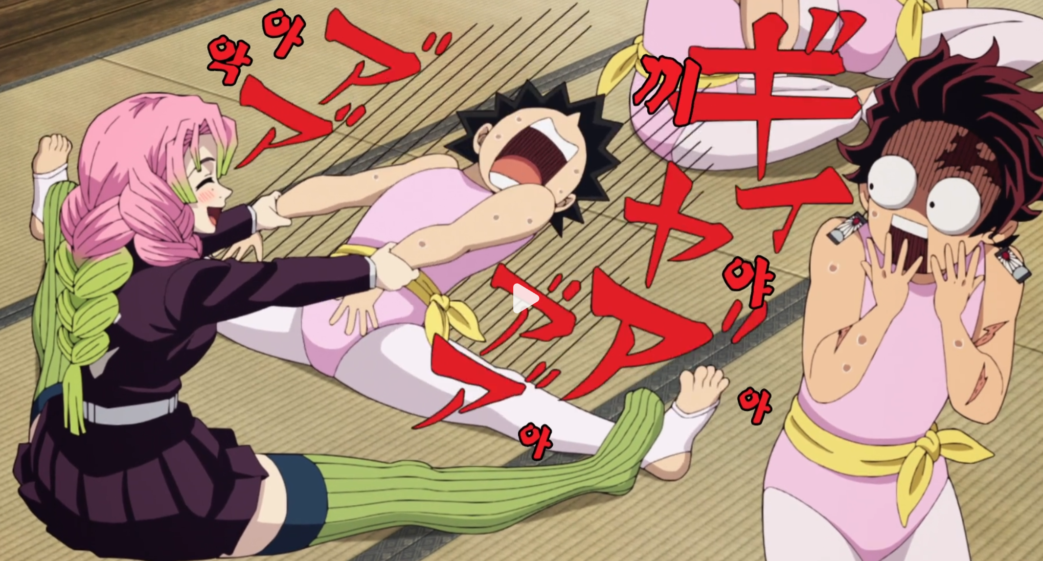 웃는 얼굴로 일반 대원을 고문하는 미츠리의 모습에 탄지로는 기겁합니다. 근육을 풀어주기보다는 힘으로 근육을 찢는 느낌입니다. 항상 긍정적이던 탄지로마저 미츠리의 훈련이 지옥이라고 생각합니다.