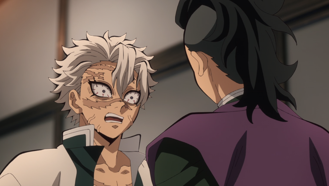 사네미에게 할 말이 있어서 찾아온 겐야에게 사네미는 자신은 동생 따위 없으며 겐야는 재능이 없기 때문에 귀살대를 떠나라는 막말을 퍼붓습니다. 겐야는 검사로서 재능이 없기 때문에 자신의 특이 체질을 이용하여 오니를 먹으며 자신을 단련했습니다.