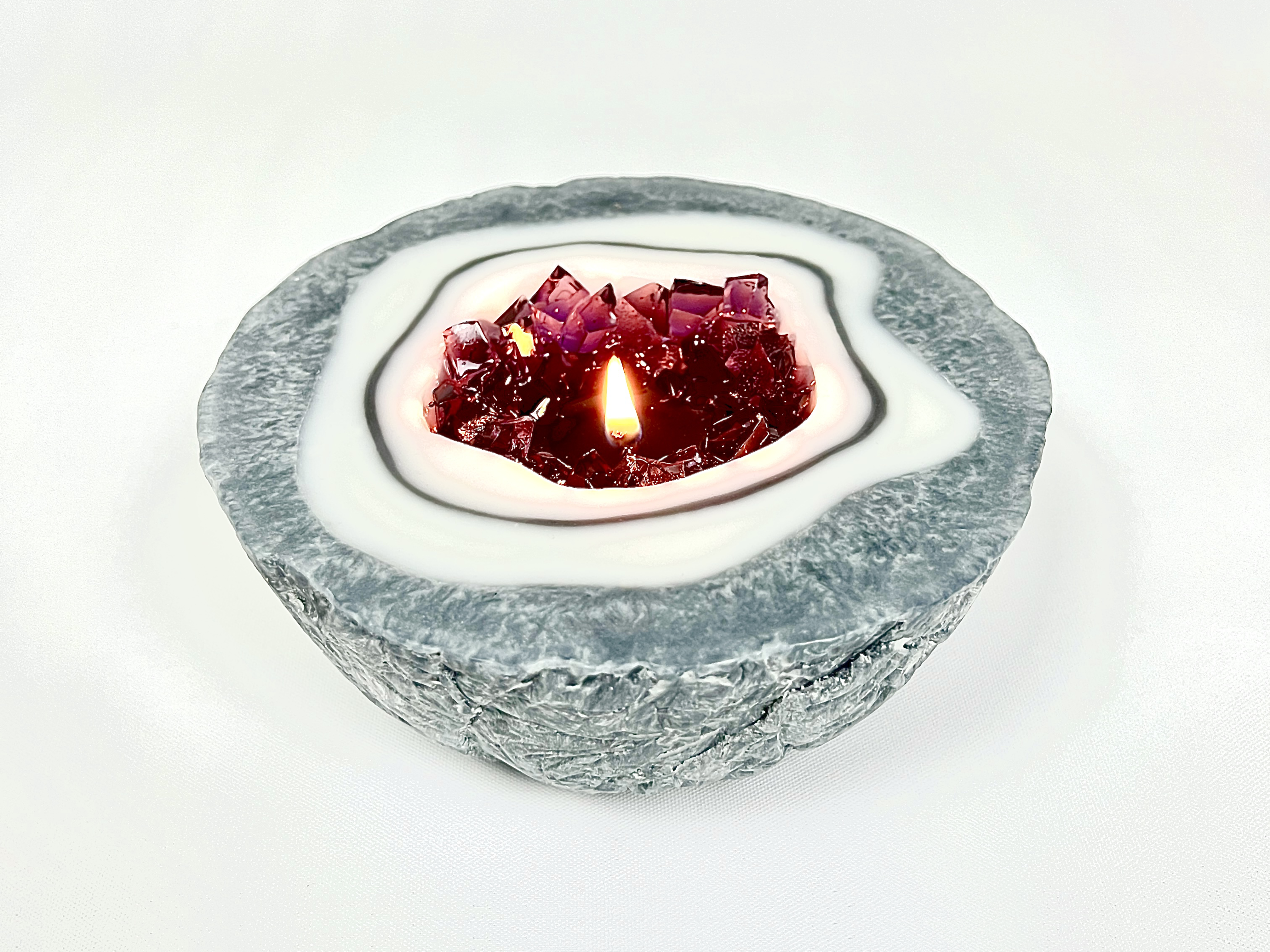 자연에서 발견된 돌을 반으로 자른 듯한 디자인이 상당히 특이합니다. 자연스러운 질감과 모양을 위해 수제 제작을 하고 있으며 그래서 각 제품마다 모양의 차이가 있습니다. 가운데 부분은 둥글게 파여있으며 아름다운 자수정 젤리로 채워져 있습니다. 어두운 곳에서 양초에 불을 붙이면 자수정 젤리가 은은하게 빛이 납니다.