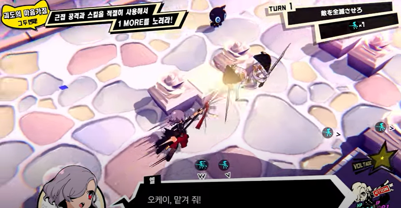 앞에서 언급한 것처럼 '1 MORE'는 특수한 조건 달성 후 추가 행동 턴을 얻는 것입니다. 기본적으로 가드 상태가 아닌 적에게 대미지를 주면 발동합니다. 적의 가드 상태를 해제하기 위해서 근접 공격을 통해 적을 엄페물에서 떨어뜨릴 수 있습니다. 또한, 페르소나 스킬을 사용하여 적의 가드 상태를 해제할 수 있습니다. 페르소나는 SP (스킬 포인트)를 사용하기 때문에 여러 번 사용하기 힘듭니다. 이전 작품에서도 SP가 많이 모자라서 페르소나를 전략적으로 써야 했습니다. 갑자기 신규 캐릭터인 '엘'도 페르소나를 사용할 수 있는지 궁금해졌습니다.