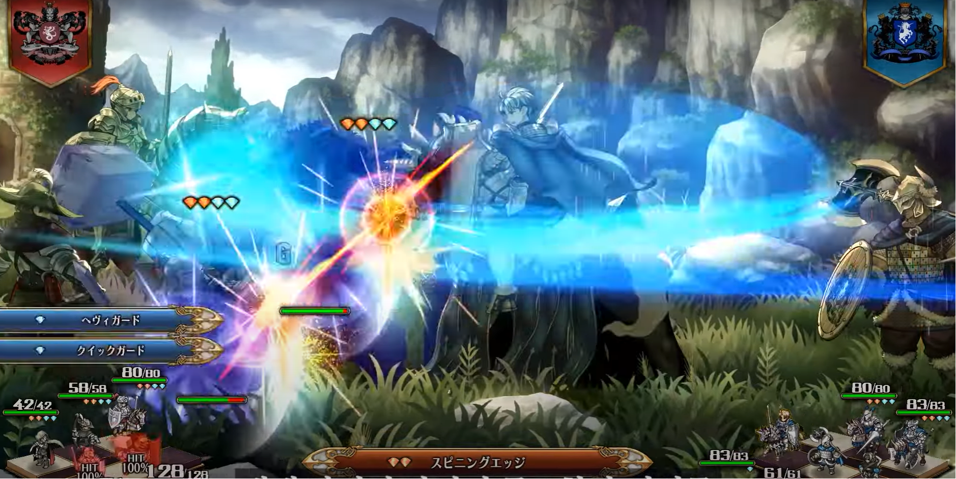맵 상의 유닛을 이동시켜 오브젝트 (적)와 충동하면 전투가 발생합니다. 전투에 진입하면 각 진영 캐릭터의 실제 모델링을 볼 수 있습니다. 아래쪽에 캐릭터 배치도를 확인할 수 있는 데 전위 2명에게만 Hit가 나오는 것을 보면 각 캐릭터마다 공격 범위가 있거나 전위 및 후위 시스템이 중요한 것 같습니다. 명중률도 존재합니다.