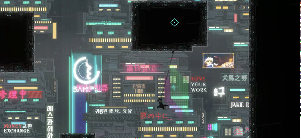 캐릭터의 복장과 게임 속 배경을 보면 조선 시대와 사이버펑크를 잘 조합한 도트 드래픽의 화려한 세계관을 확인할 수 있습니다. 한국 인디게임 개발사에서 제작한 게임인 만큼 사이버펑크 느낌의 도시를 화려하게 장식한 한국어 간판들을 확인할 수 있습니다.