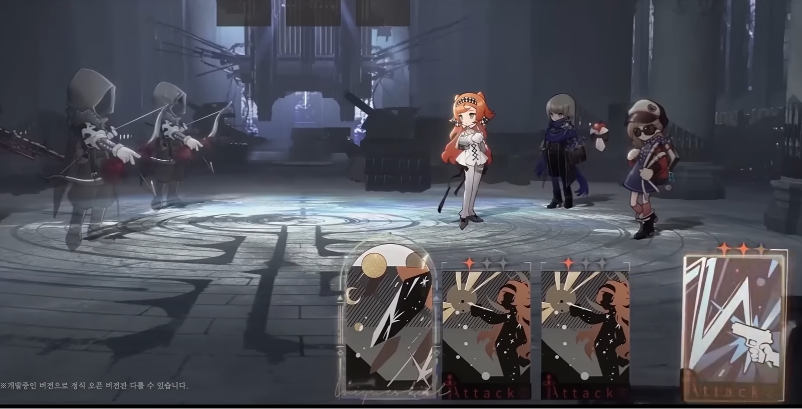 최대 4인 파티로 전투를 진행합니다. 4인 파티 기준 매 턴 4개의 행동력을 가지고 있습니다. 스킬을 사용하기 위해 스킬 카드를 화면 중간에 배치하거나 카드 순서를 바꿀 때마다 행동력을 소모합니다. 같은 카드가 서로 붙어있는 경우 카드가 하나로 합쳐지며 카드 등급이 올라갑니다. 카드 등급이 올라가면 대미지가 증가하거나 효과가 강화되는 것 같습니다.