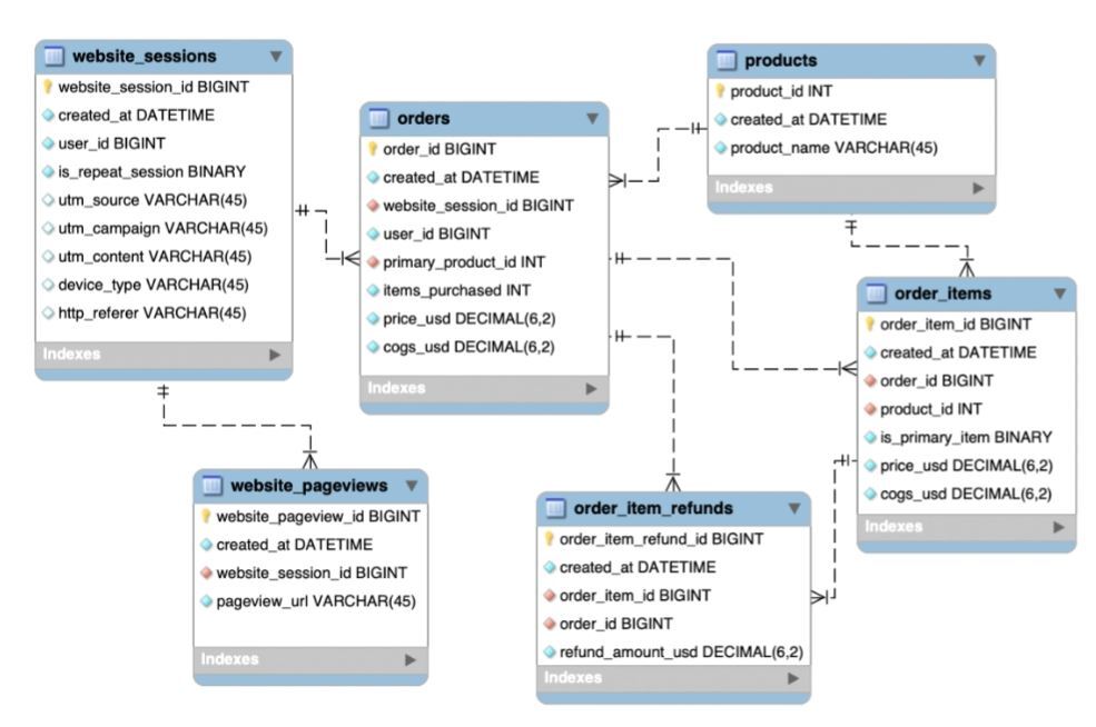 아래 온라인 스토어 데이터 스키마가 있습니다. nonbrand 캠페인 gsearch 소스의 광고 예산을 2012년 4월 15일부터 줄였습니다. 예산을 줄인 후 nonbrand 캠페인 gsearch 소스의 광고 성과를 분석하겠습니다.