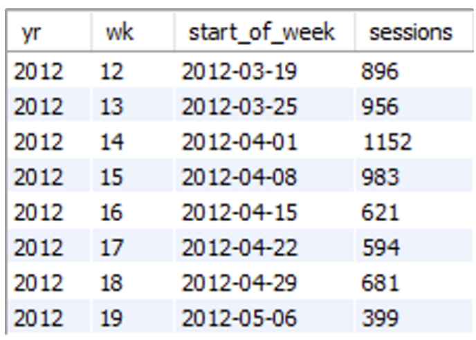 2012년 연도만 따로 표시하기 위해 YEAR 함수를 사용합니다 YEAR(created_at) AS yr. 또한, 해당 연도의 몇 번째 주인지 따로 표시하기 위해 WEEK 함수를 사용합니다 WEEK(created_at) AS wk. 그리고 해당 주의 첫 번째 날짜를 표시하기 위해 MIN 함수 사용합니다 MIN(DATE(created_at)) AS start_of_week. 날짜 데이터의 형식이 문자 형식일 수도 있기 때문에 DATE 함수를 사용하여 날짜 형식으로 만들어줍니다. 마지막으로 총 방문자 수를 COUNT 함수를 사용하여 구해야 하는데 중복 방문자를 제외하기 위해 DISTICT 함수를 사용합니다 COUNT(DISTINCT website_session_id) AS sessions. AS를 사용하여 별칭을 설정할 수 있습니다.