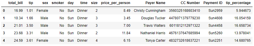 df라는 이름을 붙인 DataFrame에 "tip_percentage"라는 열을 추가합니다. 해당 열의 데이터는 "tip"에 100을 곱한 값을 "total_bill"로 나눈 값입니다.