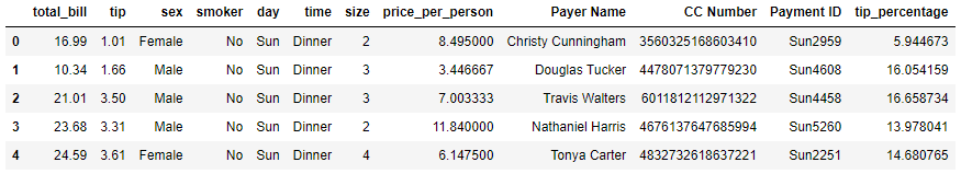 df라는 이름을 붙인 DataFrame에 "tip_percentage"라는 열을 추가합니다. 해당 열의 데이터는 "tip"에 100을 곱한 값을 "total_bill"로 나눈 값입니다.