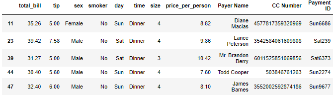 df['total_bill']>30는 불러온 데이터에서 total_bill이 30보다 큰 행만 가져온다는 뜻입니다. 실제로 해당 행만 불러온 데이터에서 가져오기 위해 df[df['total_bill']>30]와 같이 df (불러온 데이터)를 한번 더 입력합니다.