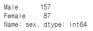 value_counts 함수를 사용하면 특정 열에 있는 데이터 항목의 수를 확인할 수 있습니다. 불러온 데이터의 "sex" 열에는 2개의 데이터 항목 (male과 female)이 있으며 각각의 총 수는 157과 87입니다.