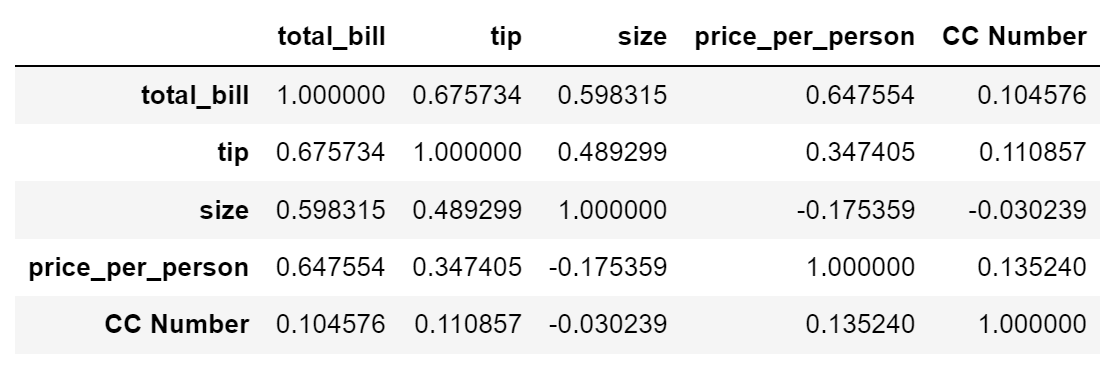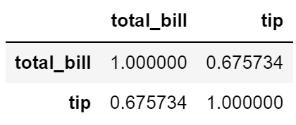 위의 코드와 같이 특정 열 데이터의 상관관계만 확인할 수 있습니다. "total_bill"과 "tip"의 상관관계는 의미가 있는 것 같습니다.