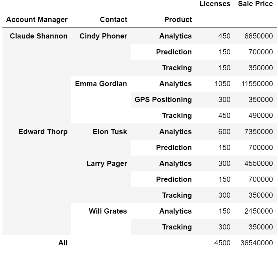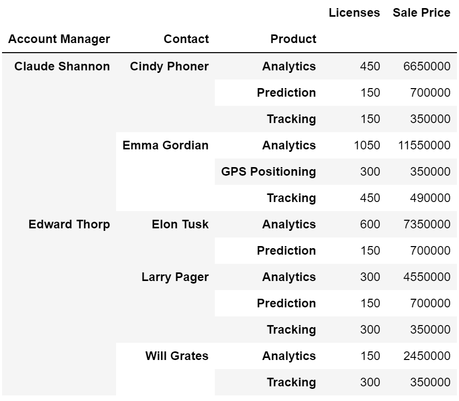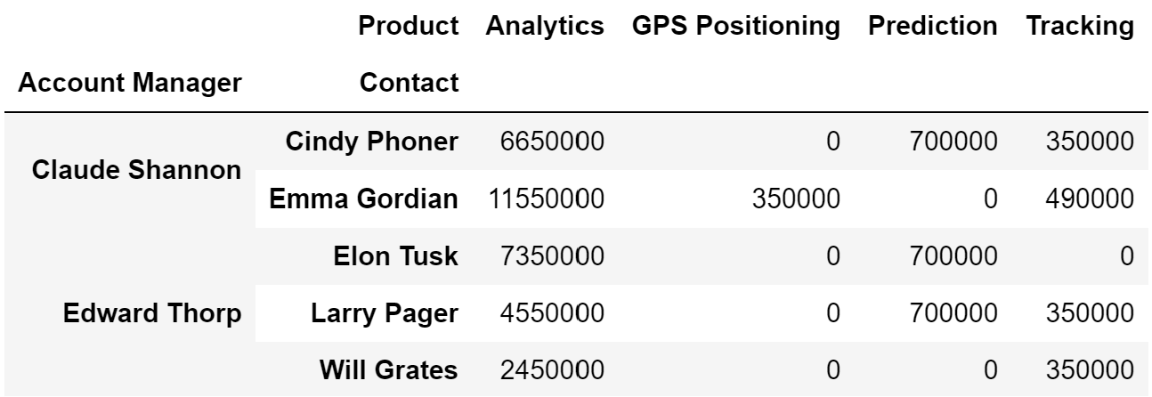 df 데이터프레임을 불러오고 "Account Manager"과 "Contact" 열 값을 인덱스로 지정합니다. "Product"를 열 값으로 지정하고 "Sale Price" 값의 합을 반환합니다. 결과를 보면 인덱스에 따라 제품 판매 가격의 합이 반환된 것을 확인할 수 있습니다.