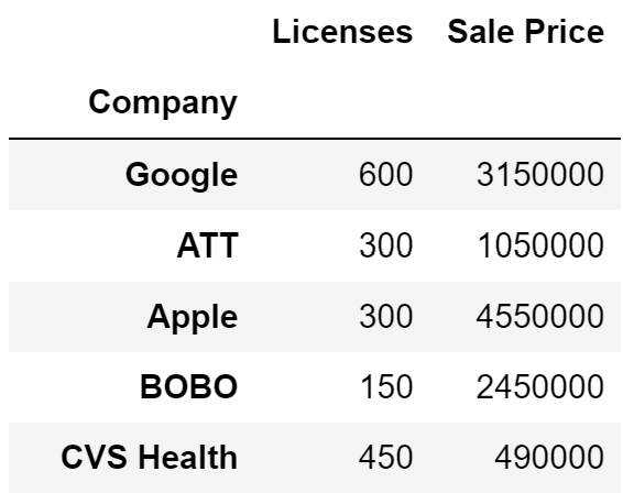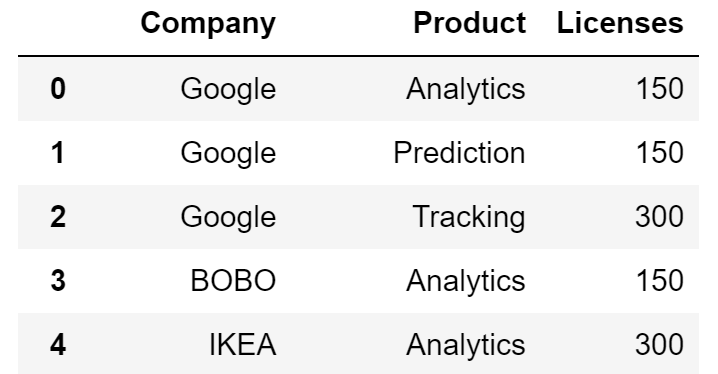 "Company", "Product", 그리고 "Licenses" 열을 사용하여 새로운 데이터프레임을 만듭니다.