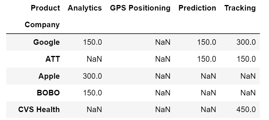 위의 데이터프레임 결과가 한눈에 들어오지 않기 때문에 "Product" 열 카테고리를 인덱스로 지정합니다. 결과를 보면 훨씬 깔끔한 데이터프레임을 확인할 수 있습니다.