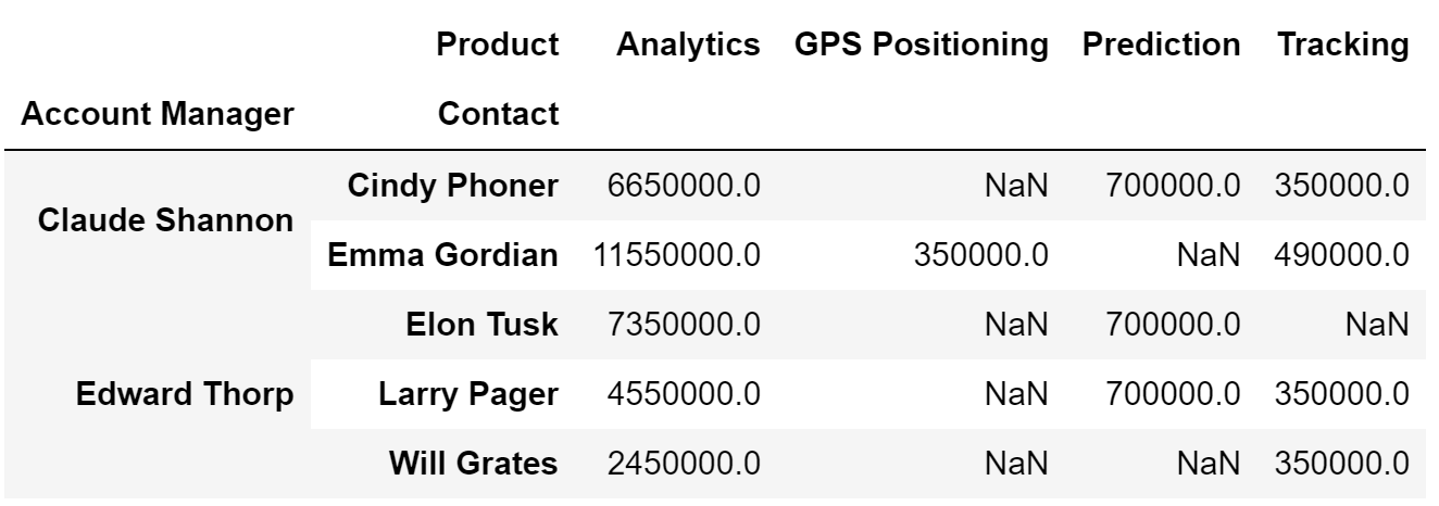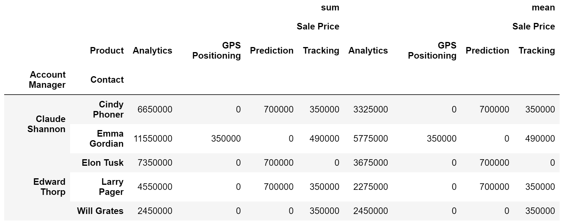 df 데이터프레임을 불러오고 "Account Manager"과 "Contact" 열 값을 인덱스로 지정합니다. "Product"를 열 값으로 지정하고 "Sale Price" 값의 합을 반환합니다. 결과를 보면 인덱스에 따라 제품 판매 가격의 합이 반환된 것을 확인할 수 있습니다.