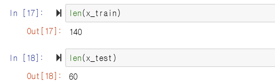 이제 데이터 분할을 준비합니다. train_test_split 함수를 이용하여 x 변수와 y 변수를 학습 및 테스트 데이터로 분할합니다. test_size=0.3은 각 변수 데이터의 30%만 테스트 데이터로 사용한다는 의미입니다. random_state는 크게 중요한 부분은 아니며 실행 결과가 동일하게 나올 수 있도록 임의의 숫자를 적어주면 됩니다. 테스트 데이터의 총 행 수는 60 (200의 30%)이며 학습 데이터의 총 행 수는 140인 것을 확인할 수 있습니다.
