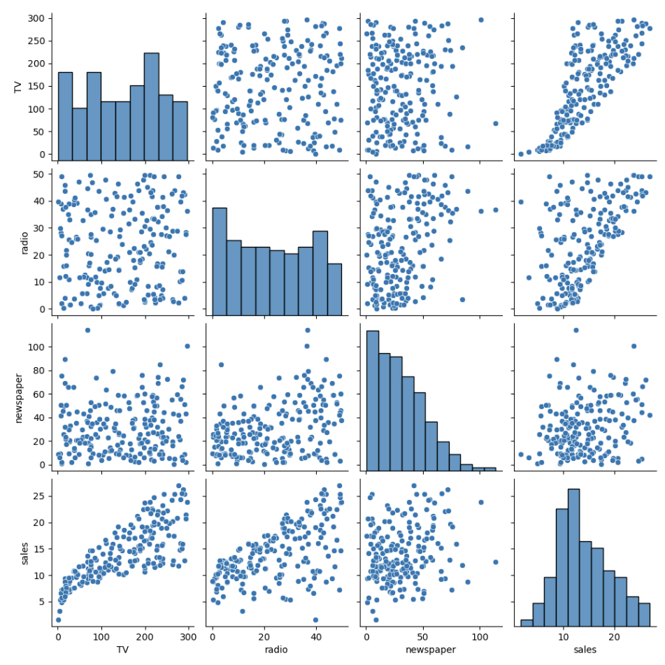 2번째 열에 있는 그래프는 라디오 예산과 판매량의 관계 그리고 3번째 열에 있는 그래프는 신문 예산과 판매량의 관계를 보여주고 있습니다.